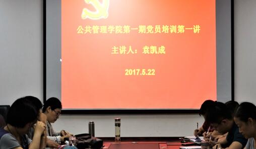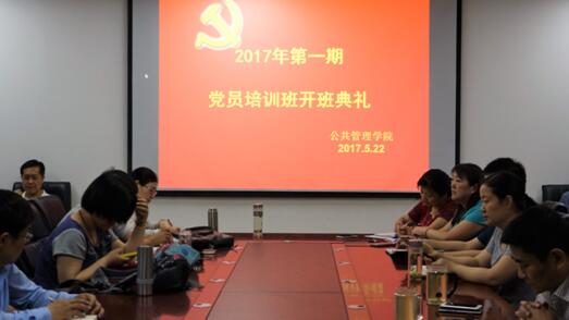 5月22日下午2点半,公共管理学院于教科632举行2017年第一期党员培训班开班典礼暨第一讲。公共管理学院党委全体领导班子成员出席此次会议,院党委副书记冯建栋主持,公共管理学院教职工党员及学生党员参加会议。