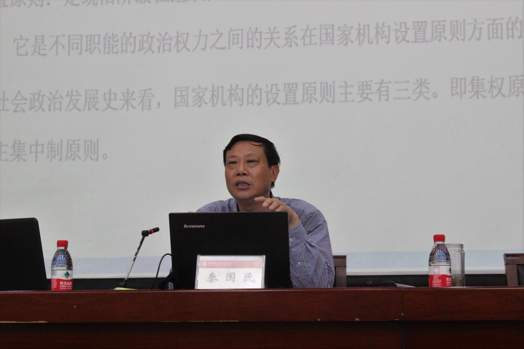 6月25日下午2点半,我院邀请郑州大学公共管理学院教授、法学博士、中国政治学会理事兼副秘书长、中国行政管理学会理事、中国行政体制改革研究会理事秦国民莅于第一教学楼220报告厅展开了一场关于党和国家机构改革:实现国家治理能力现代化的重要举措的专题报告会。此次报告会吸引了众多学生前来参与聆听。