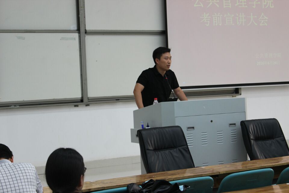 为落实学校关于学生考试纪律要求,保持公共管理学院优良风尚,6月24日下午,公共管理学院于教科210召开2015-2016学年第二学期考前宣讲大会。院系领导、老师及各年级学生代表共同参加会议。政治辅导员黄钊坤担任主持人。