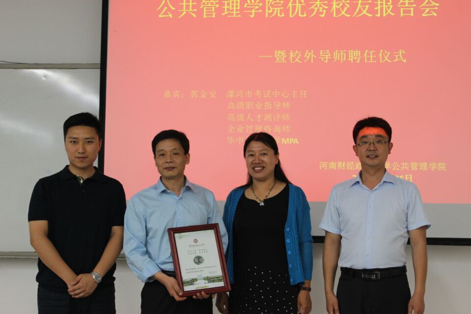 5月25日晚7点,公共管理学院优秀校友报告会暨校外导师聘任仪式在教科楼116教室举行。会议邀请我校优秀校友,院系相关领导老师及人力资源管理专业学生参加会议。会议由党委副书记冯建栋主持。