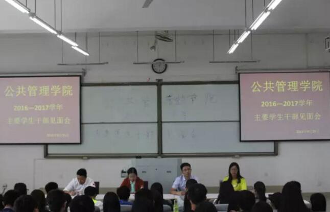 为促进师生交流,增强学生干部责任意识,9月29日中午1时,公共管理学院于教一215召开2016-2017学年主要学生干部见面会。本次会议由公共管理学院团委书记李芳主持,党委副书记冯建栋,政治辅导员卫艳涛、黄钊坤出席会议,2016级全体主要学生干部及各班班长、团支书参加本次会议。